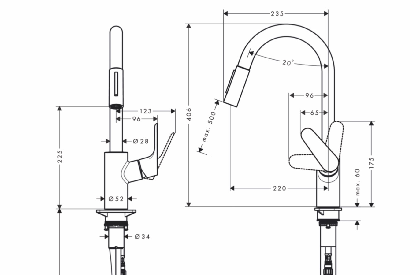 Mezcladora monomando para cocina con manguera extraible, dos cambios de chorro y cuello giratorio.